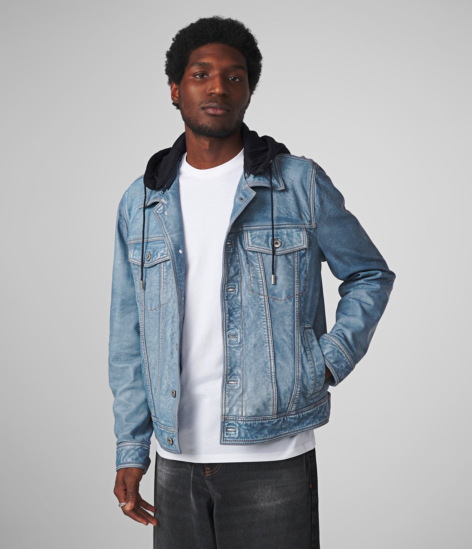 Crew Denim Leather Jacket With Hood