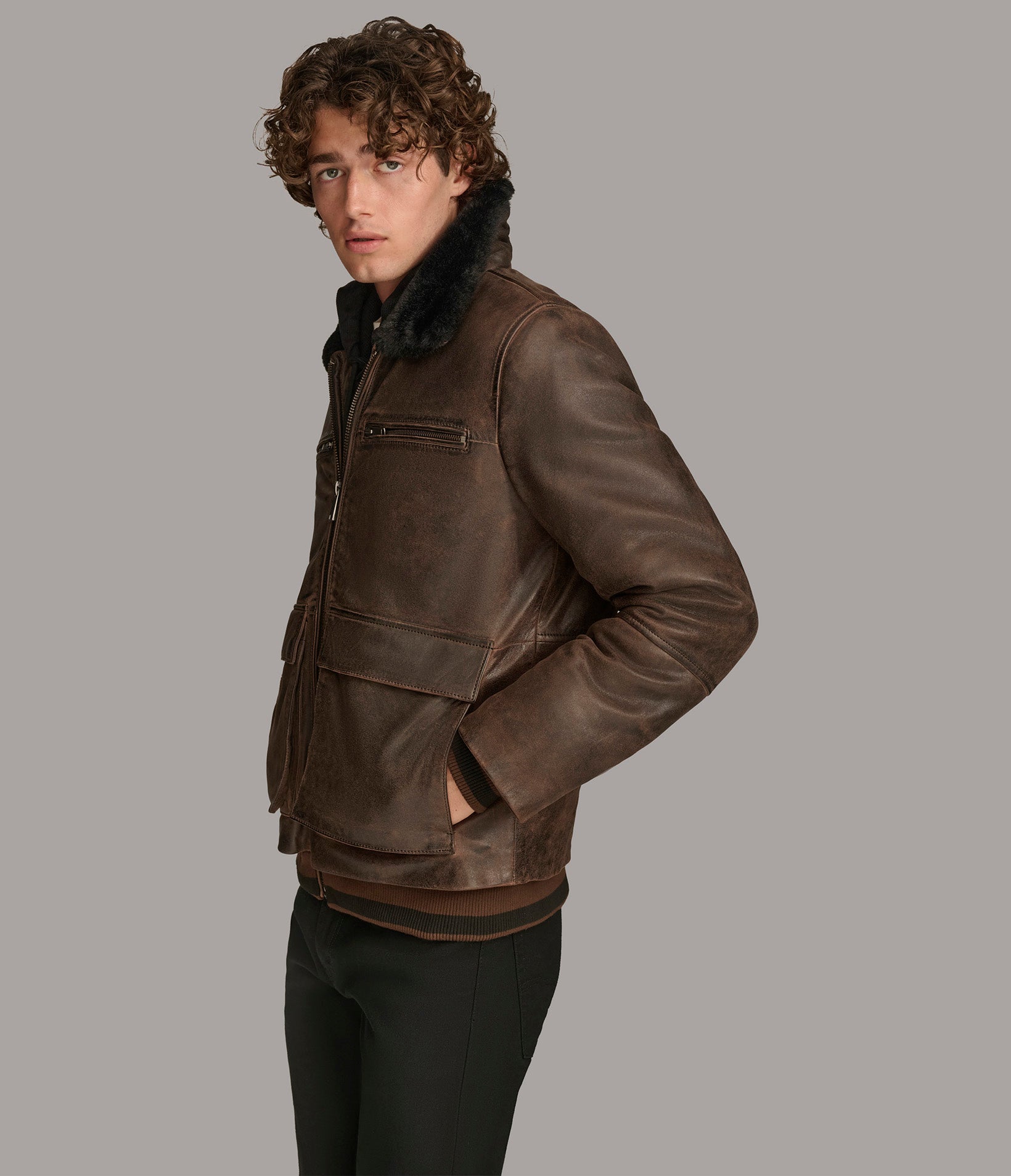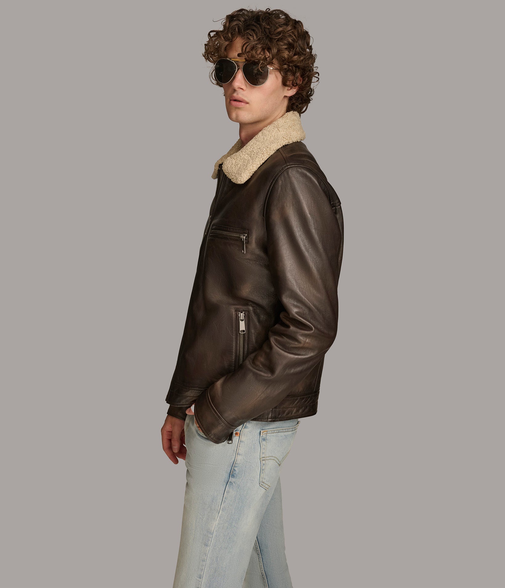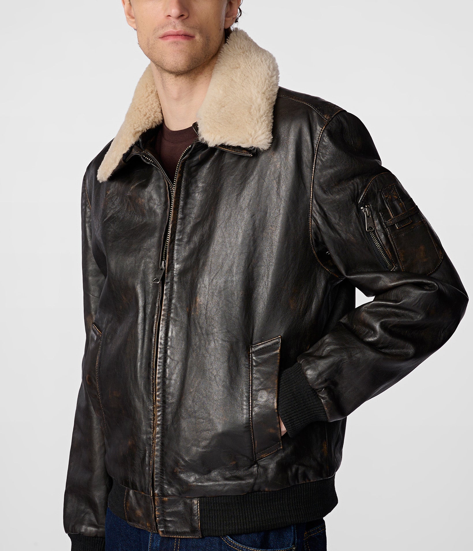 Jimmy Leather Aviator Bomber Jacket With Shearling Collar